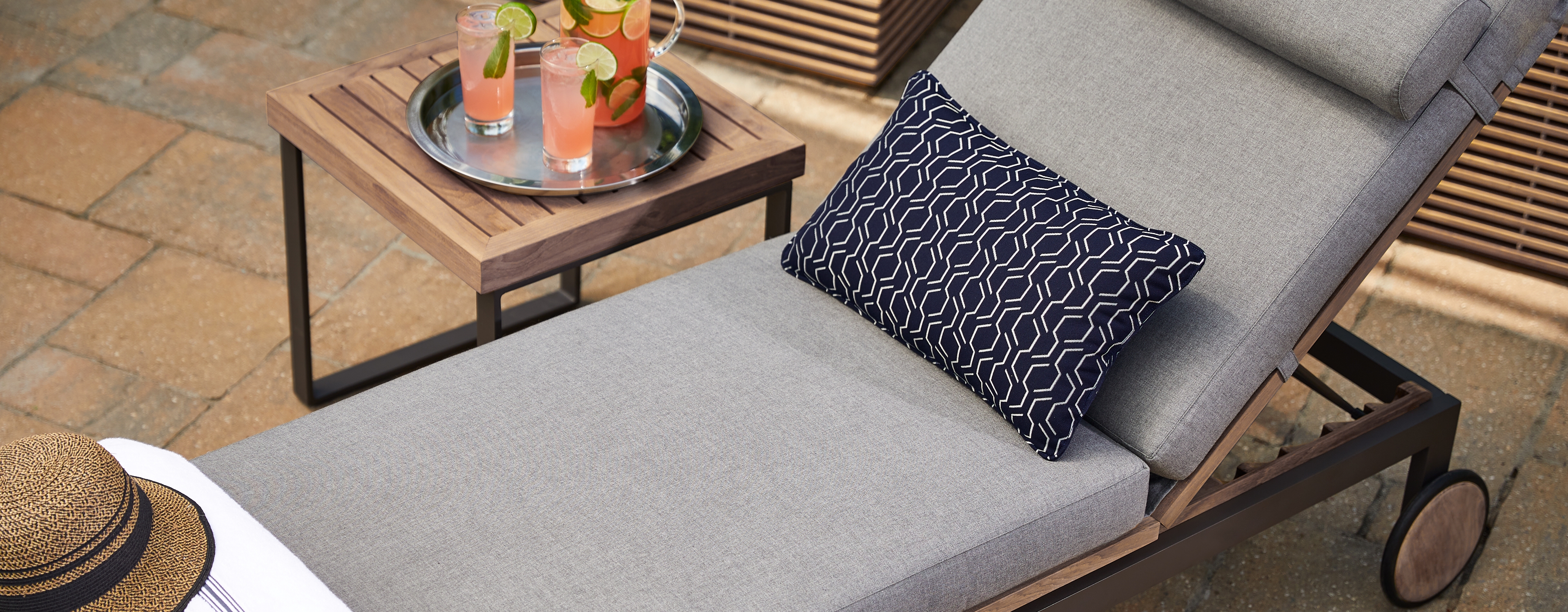 Reposition your lounger easily with teak inlay wheels with slim profile rubber treads.